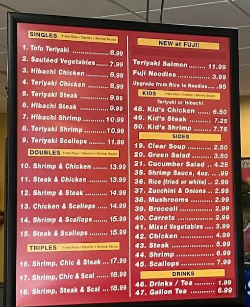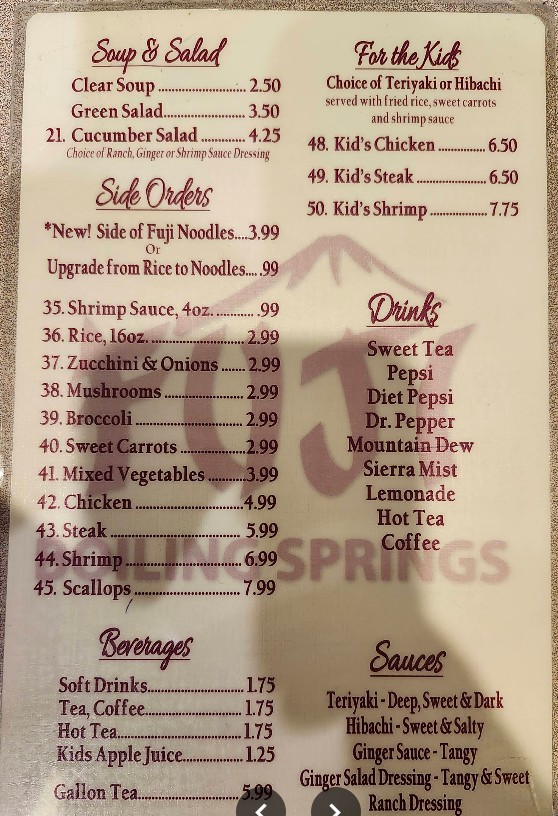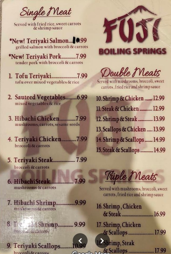 FUJI Boiling Springs brings authentic Japanese cuisine and fresh sushi to the heart of Boiling Springs, South Carolina. The FUJI Boiling Springs Restaurant menu features a wide selection of handcrafted sushi rolls, sashimi, hibachi grill entrées, teriyaki specialties, noodle dishes, and flavorful appetizers. Whether you are dining in, ordering takeout, or planning a casual night out, FUJI offers generous portions, fresh ingredients, and classic Japanese flavors at affordable prices. Browse our full restaurant menu below and discover your next favorite dish at FUJI Boiling Springs.