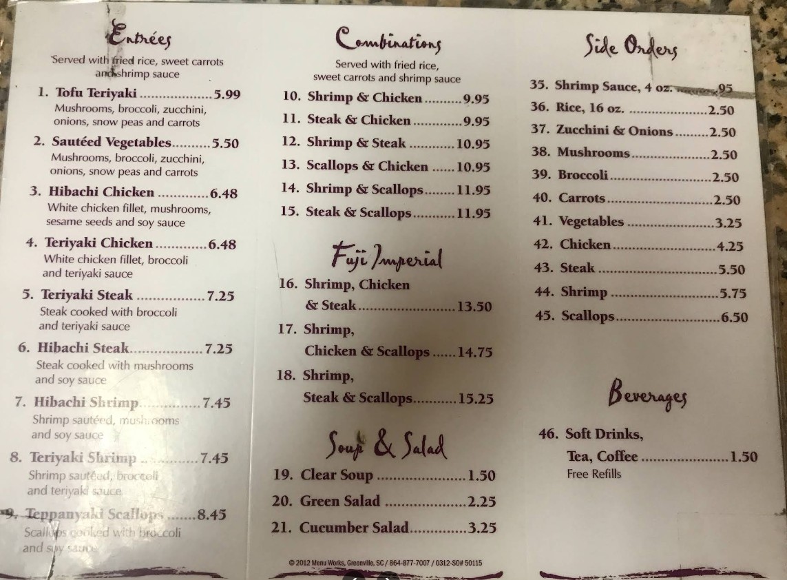 If you looking for good Japanese food that is affordable in the Boiling Springs area check out Fuji. I went and ordered for food for takeout. I ordered the hibachi salmon and chicken with fried rice. The food was flavorful and tasty. The side of carrots are sweet delicious. The hostess/cashier was professional and friendly. The place is spacious and clean. Great for families, friends and big gatherings. Plenty parking available in the plaza.